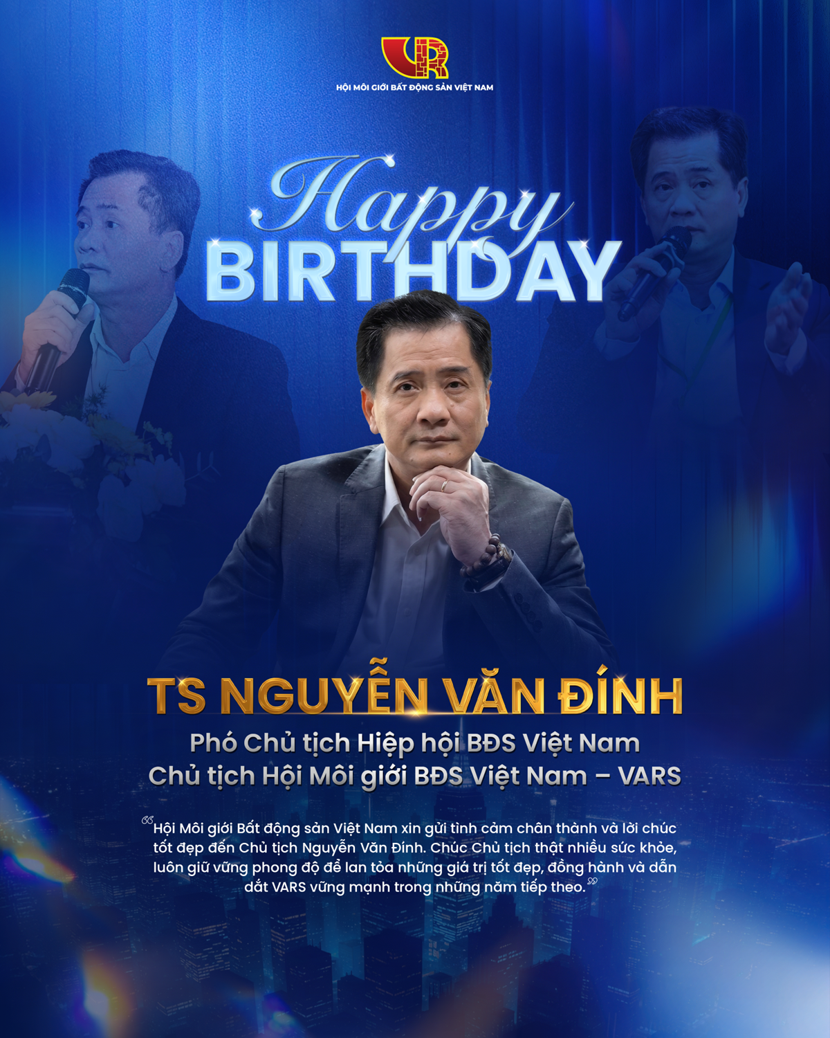Nhân ngày đặc biệt này, xin kính chúc TS. Nguyễn Văn Đính - Chủ tịch Hội Môi giới BĐS Việt Nam - VARS sức khỏe, sự vững vàng và nhiều năng lượng tích cực. Chúc cho chặng đường phía trước tiếp tục là hành trình của những giá trị được kiến tạo và lan tỏa – để nghề Môi giới bất động sản không chỉ phát triển về quy mô, mà còn trưởng thành về chiều sâu, đóng góp ngày càng tích cực cho xã hội.
