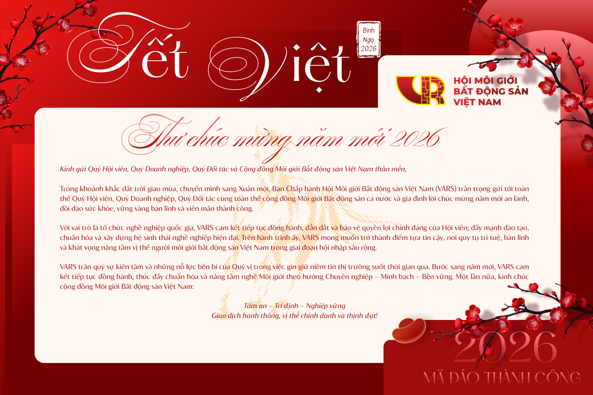 Nhân dịp năm mới, kính chúc Quý Hội viên, Quý Doanh nghiệp, Quý Đối tác và toàn thể cộng đồng môi giới bất động sản Việt Nam Tâm an – Trí định – Nghiệp vững, giao dịch hanh thông, giá trị bền lâu, sự nghiệp môi giới ngày càng chính danh và thịnh đạt.